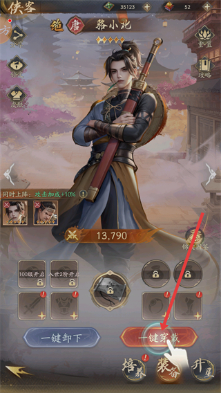 3、在俠客裝備界面可一鍵穿戴裝備,為俠客如落小北配備裝備,提升俠客戰力,增強隊伍戰斗能力。