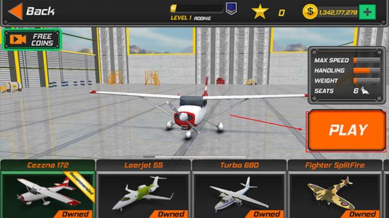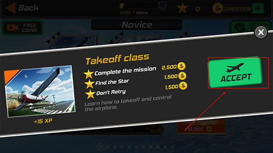 1、進入游戲在飛機列表選一架已擁有的飛機,其余飛機可以點擊購買即可,點擊PLAY進入任務界面,選擇ACCEPT接取起飛任務。