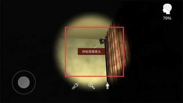 1、進入恐怖解謎游戲場景,畫面昏暗,依托手電筒光源探索,移動虛擬搖桿控制角色,在房間角落發現神秘攝像頭,點擊拾取存入物品欄,提升線索進度。