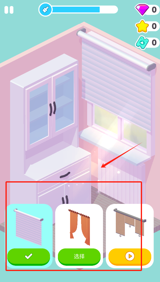 3、結束物品操作,進入裝修階段,挑選適配裝飾進行更換,確認選擇后,達成任務要求。