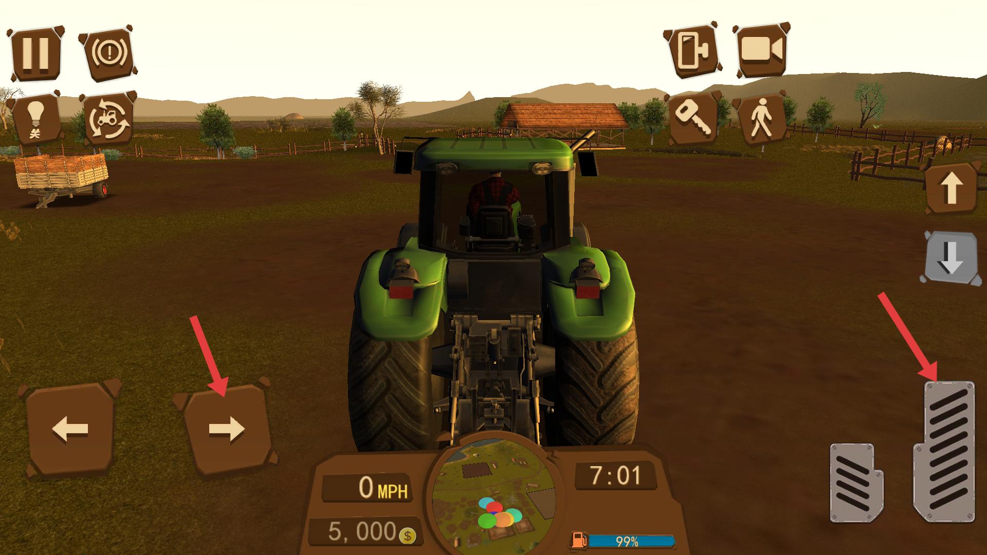 2、利用左右方向鍵和油門踏板,操控拖拉機移動,熟悉農機操作手感,為后續農場作業任務做好準備。