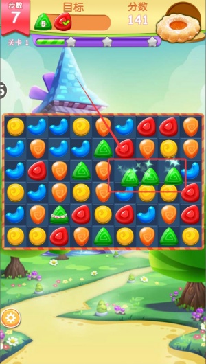 3、通過點擊相鄰的形狀塊實現位置互換,當三個或以上相同形狀連成一線時,它們就會綻放特效動畫并自動消除。