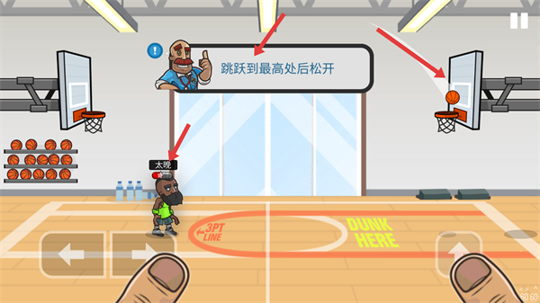 1、操控角色跳躍,等跳到最高處時松開操作,讓角色將球投向籃筐,嘗試完成投籃動作。