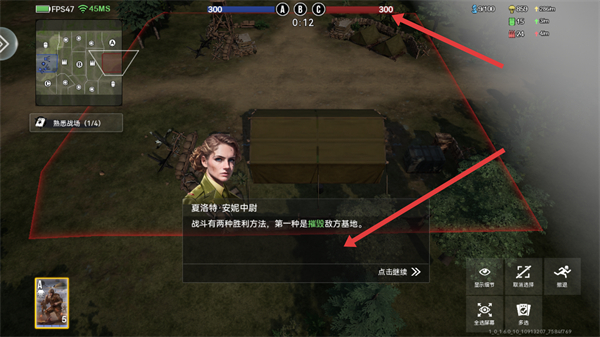1、有兩種勝利方法,第一種是摧毀敵方基地,同時可熟悉戰場,了解地圖上的據點分布,為戰斗做準備。