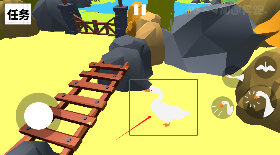 2、進入佳作場景后,依據箭頭指引,控制大白鵝移動,前往對應位置,準備執行各項任務動作。