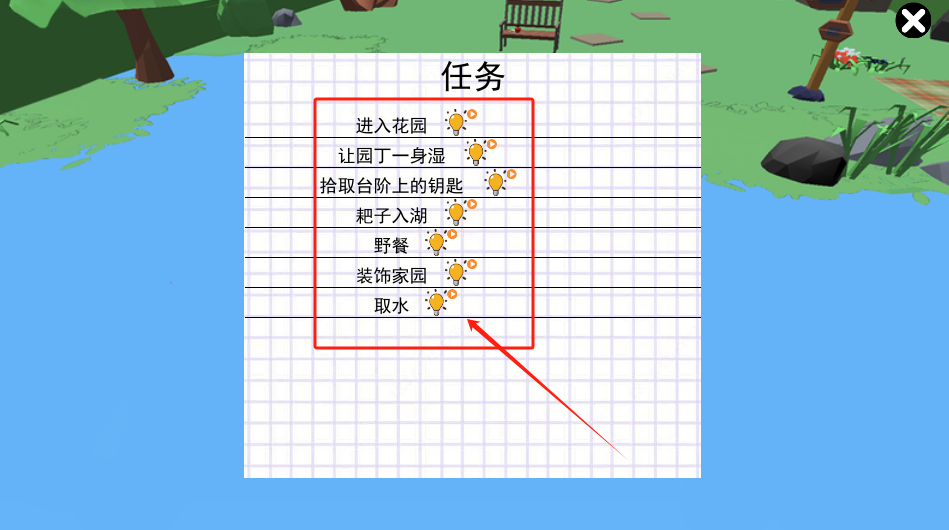 3、打開任務列表,查看如進入花園讓園丁濕身等任務內容,按任務要求,操縱大白鵝逐步完成。