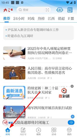 1、進入大江新聞APP新聞頁面,可見推薦、24小時等新聞分類,還有各類新聞資訊展示,底部有新聞、大江號等功能導航欄,可瀏覽各類新聞。