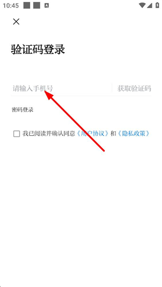 3、若需登錄,可選擇驗證碼登錄,輸入手機號、獲取驗證碼,勾選同意用戶協議和隱私政策后點擊登錄,也可選擇密碼登錄。