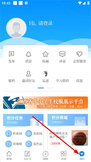 2、點擊底部我的按鈕,進入個人頁面,可看到發布、消息等功能入口,還有積分任務、積分商城板塊,未登錄時顯示Hi,請登錄。