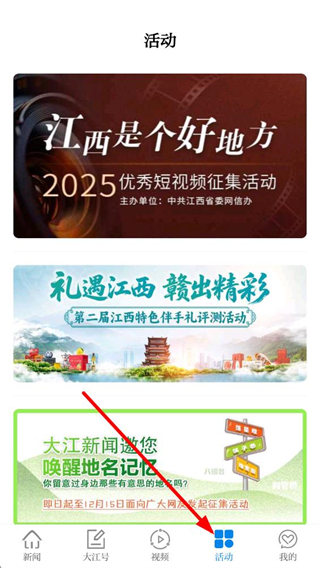 4、點擊底部活動按鈕,進入活動頁面,可看到江西是個好地方短視頻征集活動等各類活動展示,方便參與感興趣的活動。