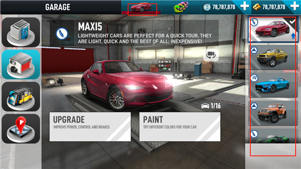 1、打開極限汽車擬駕駛模器2游戲后,點擊上方的汽車圖案,玩家可以在右方選擇你想要的車輛。
