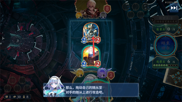 4、拖動圓球可增強角色,提升戰斗能力,合理操作卡牌和隨從,應對對手攻擊,爭取對戰勝利。