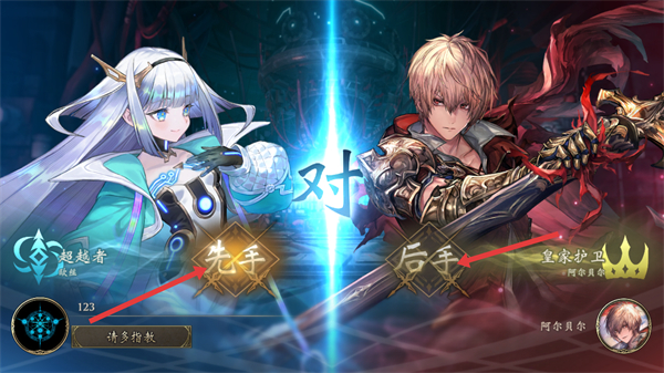 1、可選擇先手或后手,如超越者為先手,皇家護衛為后手,選擇后開啟卡牌對戰,展開對決。