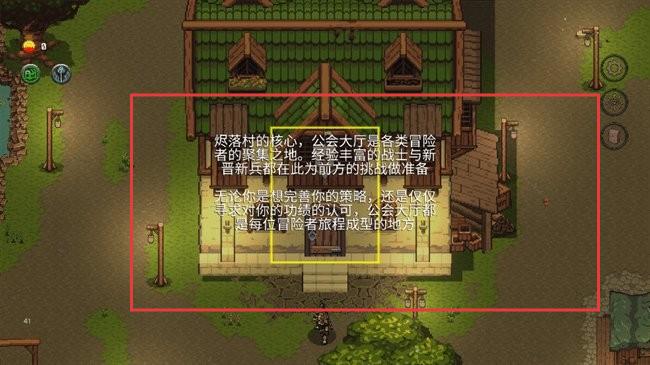 1、進入游戲村落場景,依據建筑提示,操控角色移動至公會大廳建筑,點擊進入,與內部NPC交互,了解冒險策略相關內容。
