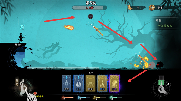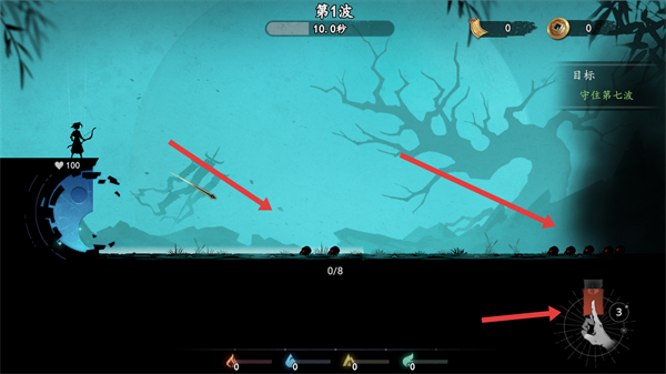4、隨著波次推進,怪物會更強大,可使用多種符咒和攻擊手段,組合應對,堅持到守住目標波次,取得勝利。