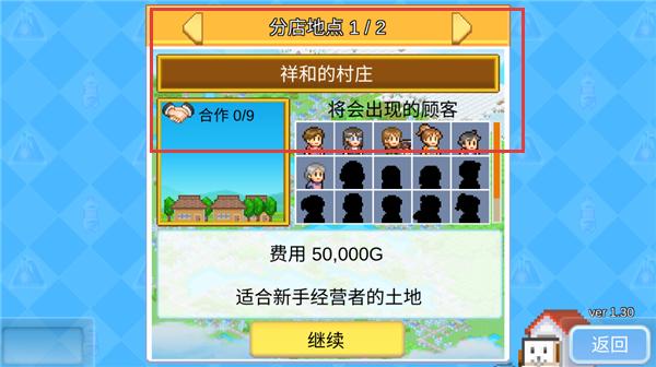 3、選祥和村莊作分店,看合作數、顧客,確認費用,點繼續,開展分店經營,拓展業務。