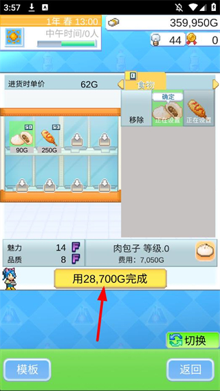 4、在進貨界面選擇肉包子等商品,確認花費金額后點擊完成,將商品補充到貨架,豐富店內的貨品種類。