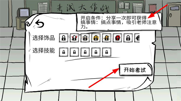 2、進入模式后可選擇飾品和技能,滿足開啟條件后點擊開始考試按鈕,即可進入考試環節,推進游戲進程。