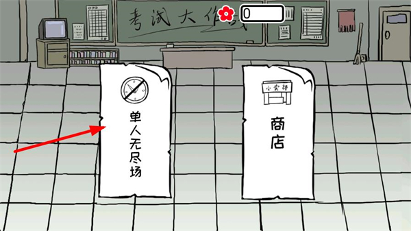 1、看到單人無盡場和商店選項,點擊單人無盡場,可進入對應的游戲模式,開啟考試相關的玩法流程。