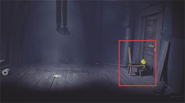 1、進入小小夢魘1風格的恐怖解謎游戲,首個場景為昏暗房間,畫面中懸掛著懸尸,紅框內呈現主角與木椅。