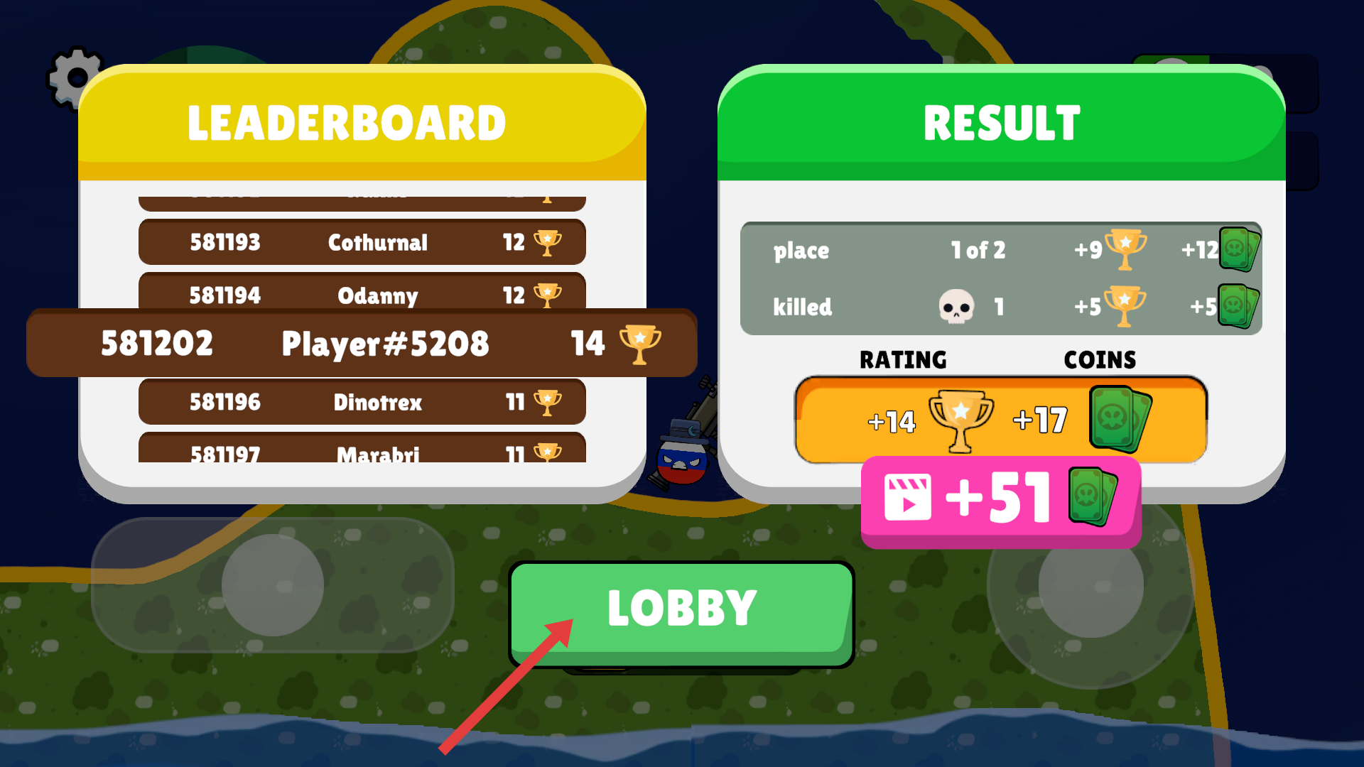 4、對局結束后,可查看排行榜知曉排名,以及本次結果里的擊殺數、獲得的獎杯與金幣等獎勵,點擊【LOBBY】返回大廳。