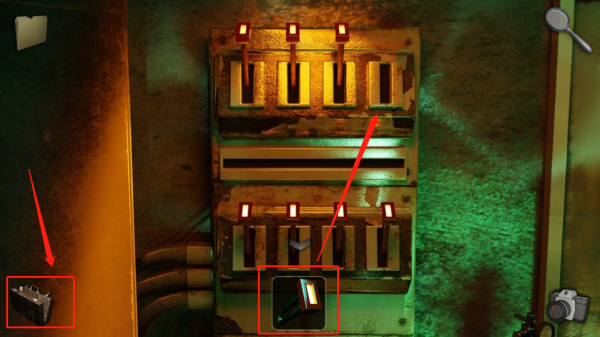 3、移動至配電盤處,點擊左側紅框標識的相機道具,利用相機照射開關,觸發與發光裝置的互動,將裝置插入開關槽位。