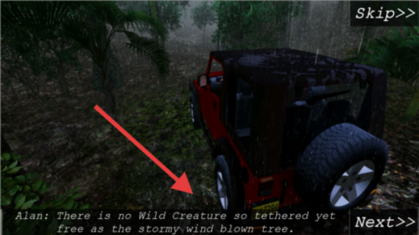 3、遇到劇情對話如叢林中紅車場景,點擊【Next】推進,理解Alan的話語,探索叢林,完成任務,解鎖后續內容。