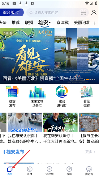 1、首頁雄安板塊有搜索欄,展示全國生態日特別節目等內容,設雄安發布等功能入口,呈現雄安相關新聞。