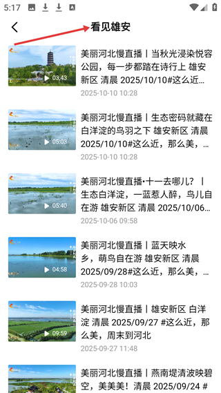 3、看見雄安頁面,推出美麗河北慢直播系列,展示悅容公園、白洋淀等雄安生態美景,多時段呈現新區自然風光。