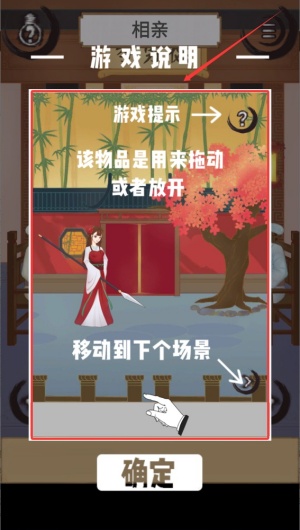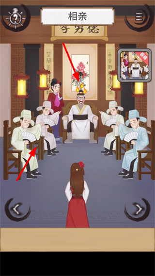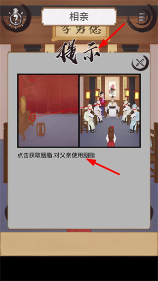 1、進入相親關卡后查看提示,按照指引點擊獲取胭脂,之后對父親使用該胭脂,推進當前場景的互動流程。