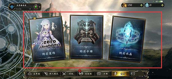 1、進入Shadowverse主界面,定位底部商店標簽并點擊,跳轉至商店頁面,識別紅框內三類商品,購買裝飾、購買卡牌、購買水晶,依據資源與需求,選定購買卡牌選項。