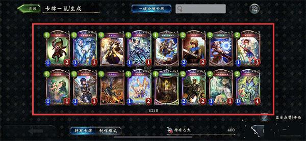 2、切換至卡牌一覽生成界面,查看紅框內陳列的卡牌庫,篩選目標卡牌,點擊選中卡牌,進入制作或獲取環節,若需合成,確認所需材料,消耗資源執行合成操作。