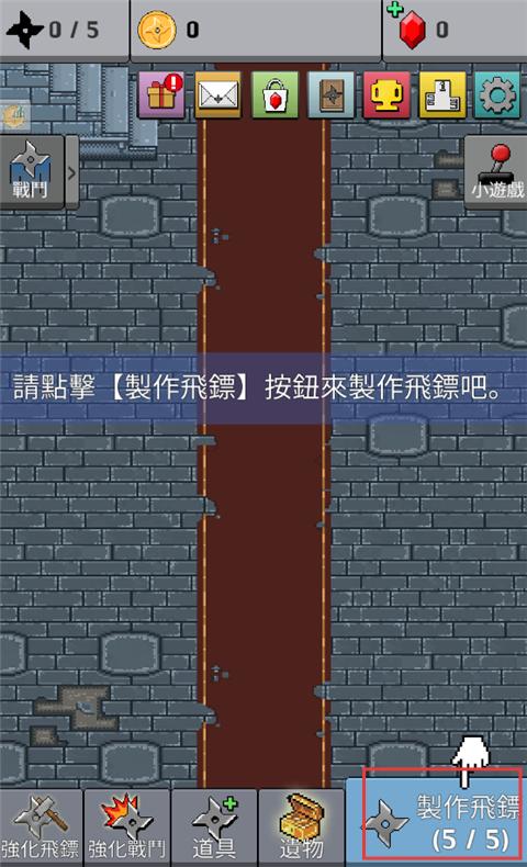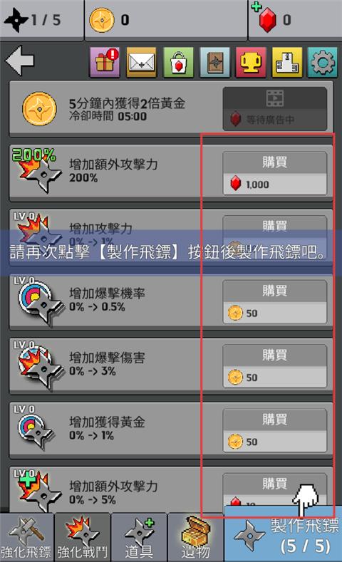 3、制作后進入強化界面,用金幣、紅鉆購買屬性加成,強化飛鏢能力,推進游戲。