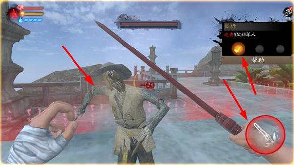 2、攻擊稻草人3次,掌握普通攻擊的操作,提升劍術攻擊的熟練度,為后續閃避和連招練習奠定基礎。