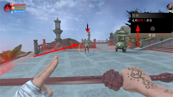 1、按照目標走到稻草人旁邊,開啟劍術試煉,熟悉戰斗場景和操作方式,為后續劍術練習做好準備。
