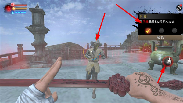 3、用閃避躲避稻草人攻擊3次,練習閃避操作,提升在戰斗過程的生存能力,應對更強的敵人攻擊。