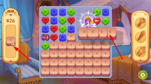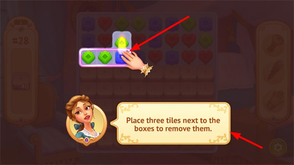 2、換裝完成后,進入消除關卡,閱讀提示Placethreetilesnexttotheboxestoremovethem,拖動紅框內的彩色方塊,放置到目標區域,使三個方塊相鄰,觸發消除。
