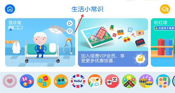 3、進入生活小常識界面,可看到急診室等啟蒙內容板塊,點擊對應板塊就能參與互動,學習相關的生活常識內容。