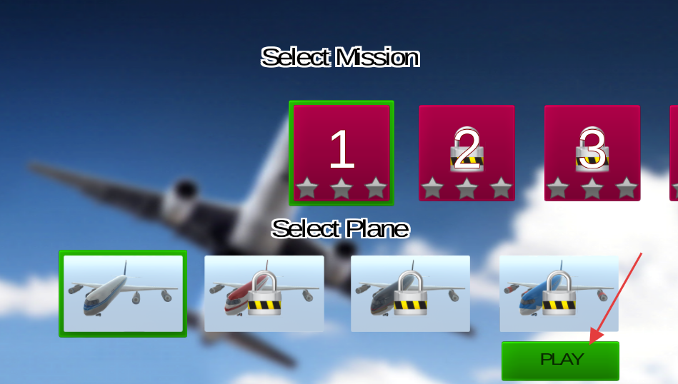 1、進入游戲點初始界面Play按鈕,到任務與飛機選擇頁,選任務1和初始解鎖飛機,點擊PLAY開啟飛行新手挑戰。