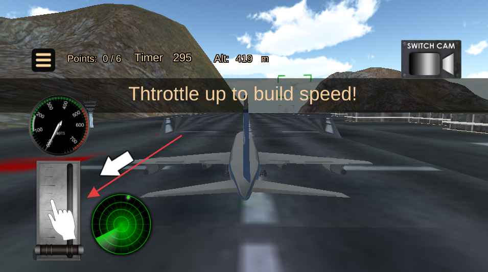 2、飛行場景按提示操作油門控制桿,推動增加飛機速度,觀察Points、Timer、Alt數據,學習基礎飛行操作與狀態監測。