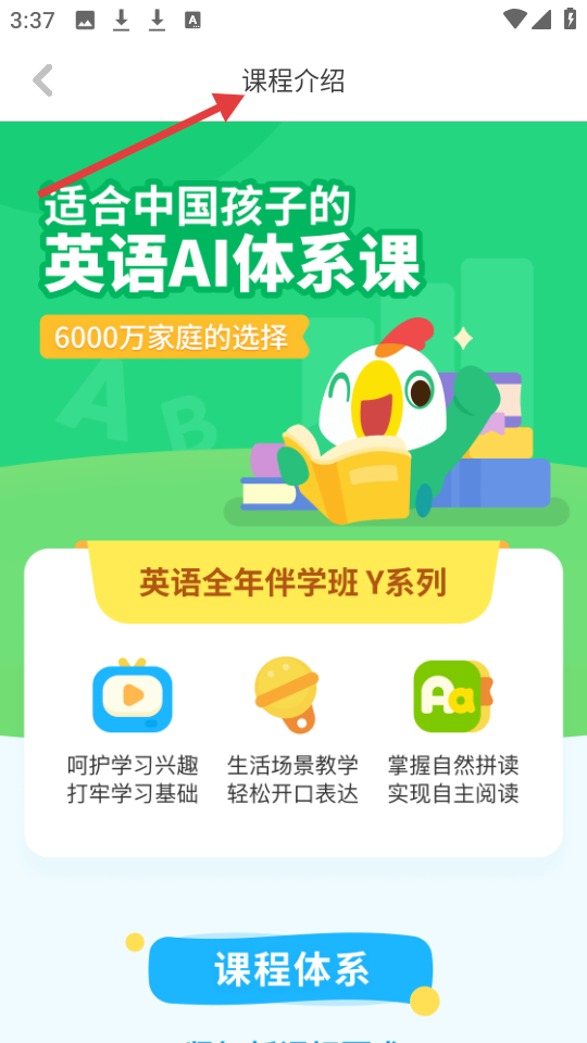 2、課程介紹頁展示適合中國孩子的英語AI體系課,英語全年伴學班Y系列亮點多受眾多家庭青睞。