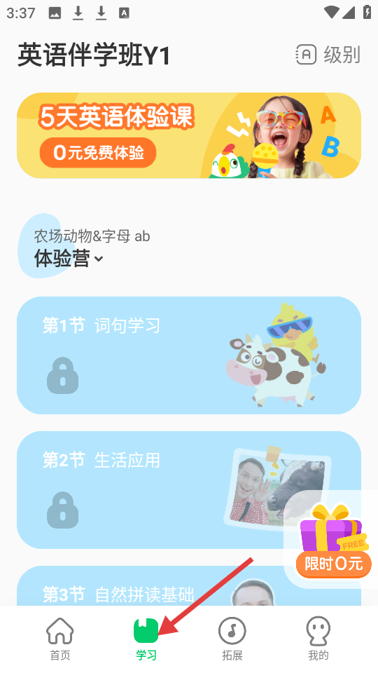 3、學習頁面呈現英語伴學班Y1體驗課內容,含農場動物等主題,分詞句學習等環節趣味滿滿。