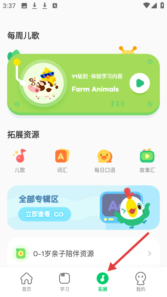 4、拓展頁面含每周兒歌與兒歌、詞匯等資源還有0、1歲親子專區,滿足不同階段英語拓展需求。
