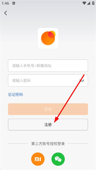 3、進入登錄頁面看到輸入手機號、郵箱和密碼的輸入框,下方有注冊按鈕,還有第三方賬號授權登錄選項,選擇注冊進入下一步流程。
