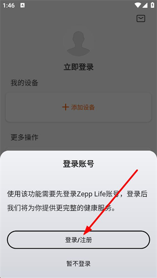 2、點擊立即登錄后彈出登錄賬號彈窗,提示使用功能需先登錄ZeppLife賬號,下方有登錄、注冊和暫不登錄按鈕,選擇登錄、注冊繼續操作。