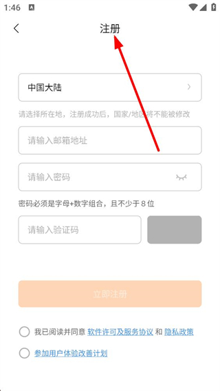 4、進入注冊頁面需先選擇所在地,接著輸入郵箱地址和符合要求的密碼,再獲取并輸入驗證碼,勾選相關協議后點擊立即注冊完成操作。