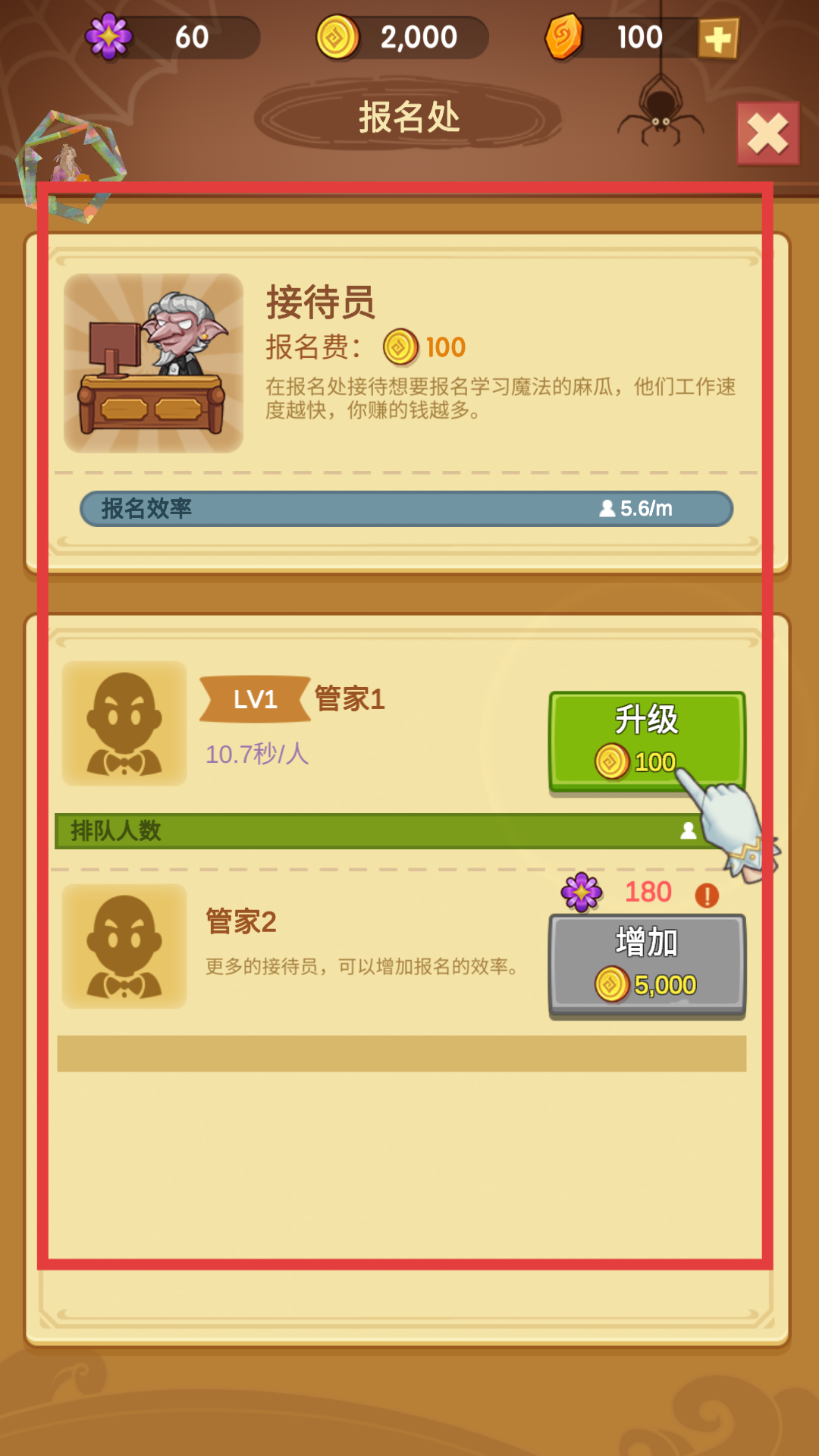 3、在報名處界面中,了解接待員的功能及報名費等信息,看到管家1的當前等級和服務效率,點擊升級按鈕,消耗對管家1進行升級,以提升報名效率。