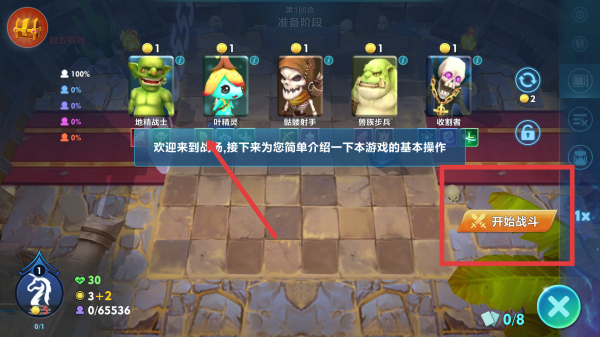 1、玩家下載游戲之后,玩家可點擊開始戰斗進入對局,處于準備階段,介紹基本操作引導玩家。