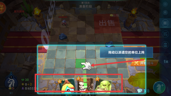 2、提示玩家拖動以派遣您的單位上陣,下方有可派遣的英雄卡牌,玩家需布置陣容后點擊開始戰斗。