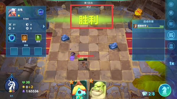 3、戰斗結果界面,顯示勝利,表明玩家在第1回合取得勝利,呈現了龍龜等英雄及傷害數據。